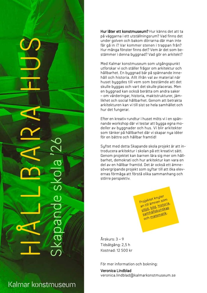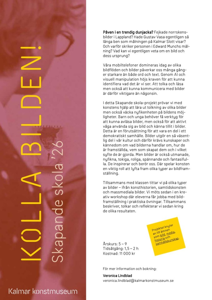 Kalmar konstmuseum är en fantastisk plattform och utgångspunkt för skolor och olika pedagogiska verksamheter, där vi arbetar utifrån konstmuseets varierande utställningar. Här kan man hitta teman och arbetsområden som berör de olika skolämnena.